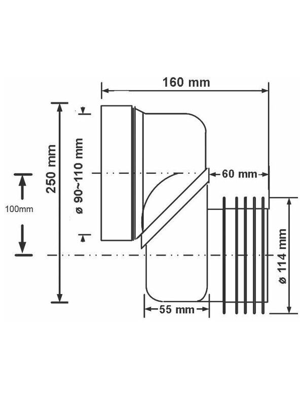 Фановая труба (L160мм) с прокладкой и 100мм смещением; вход на 90-110мм; выход вставляется внутрь 4"/110мм трубы