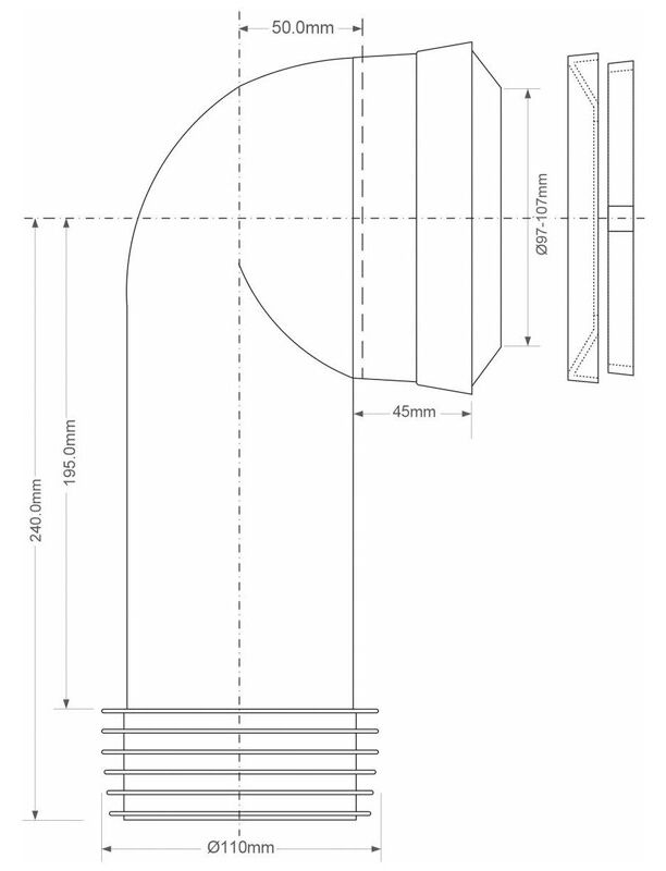 Фановая труба (L240мм) под углом 90° с уплотнительной манжетой; вход на 97-107мм; выход вставляется внутрь 4"/110мм трубы