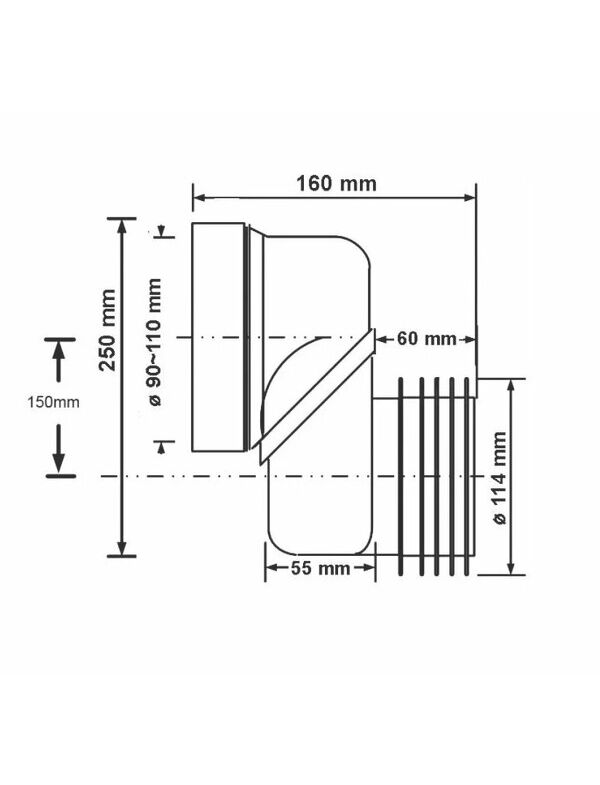 Фановая труба (L160мм) с прокладкой и 150 мм смещением; вход на 90-110мм; выход вставляется внутрь 4"/110мм трубы