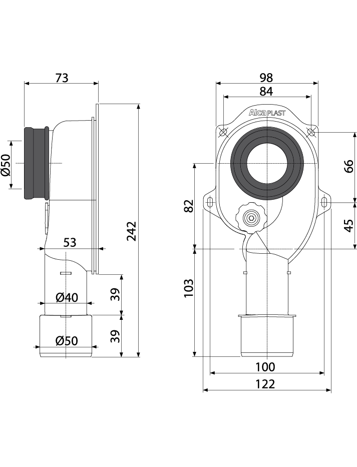 Сервисное отверстие для легкой чистки Вертикальный слив Подключение к сливной трубе 40/50 мм Подключение к писсуару 50 мм Монтажный отступ для подключения стока HT50 Материал - полипропилен