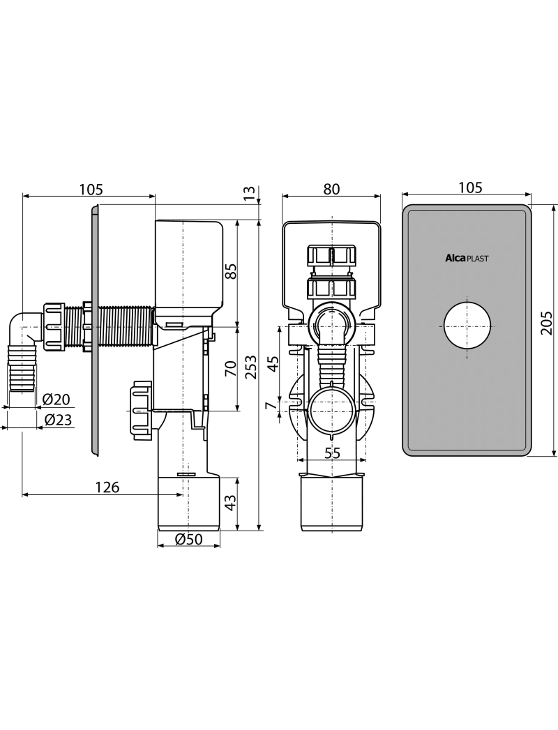 Крючки для лучшей фиксации к стене Подключение к HT 40/50 Монтажный отступ для подключения стока HT50 Вентиляционный разрывной клапан для выравнивания давления в канализационной системе Материал - полипропилен