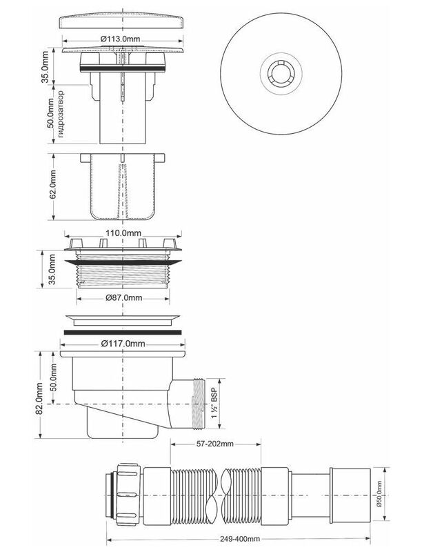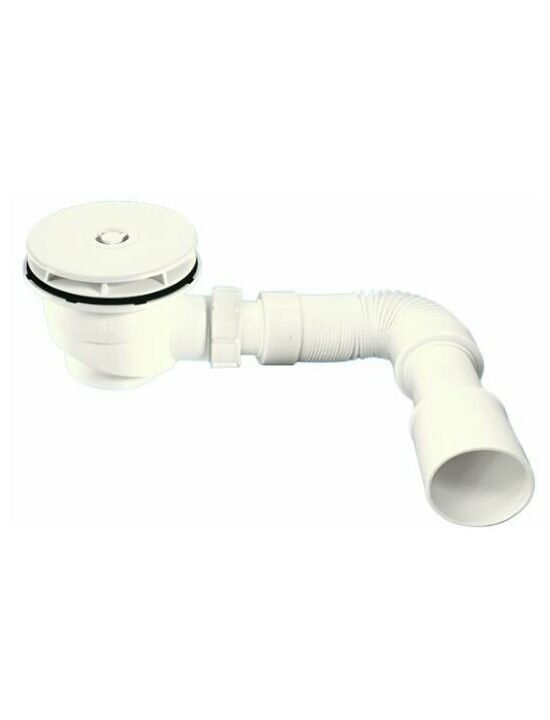 Сифон бутылочный для поддона (сливное отверстие 90-100мм) с 113мм пластиковыми выпуском и "грибком" (дизайн "Мерседес"), раздвижной (L300-500мм) отводной трубой; высота трапа 82мм; выход Дн=40/50мм; цвет-белый