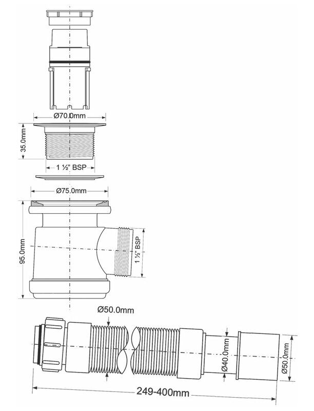 Сифон бутылочный для поддона (сливное отверстие 50-60мм) с латунными 70мм выпуском и 45мм сливной решеткой, раздвижной (L300-500мм) отводной трубой; высота трапа 92мм; выход Дн=40/50мм; цвет-хром