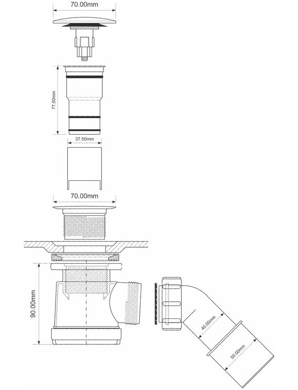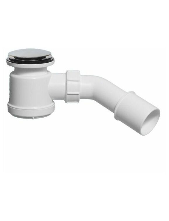 Сифон бутылочный для поддона (сливное отверстие 50-60мм) с латунными 70мм выпуском и пробкой тип-"кнопка"; высота трапа 92мм; выход Дн=40/50мм; цвет-хром сатиновый