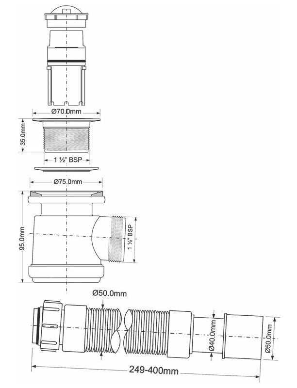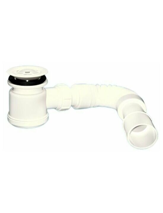 Сифон бутылочный для поддона (сливное отверстие 50-60мм) с пластиковыми 70мм выпуском и 45мм сливной решеткой, раздвижной (L300-500мм) отводной трубой; высота трапа 92мм; выход Дн=40/50мм; цвет-белый