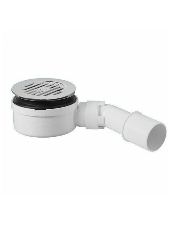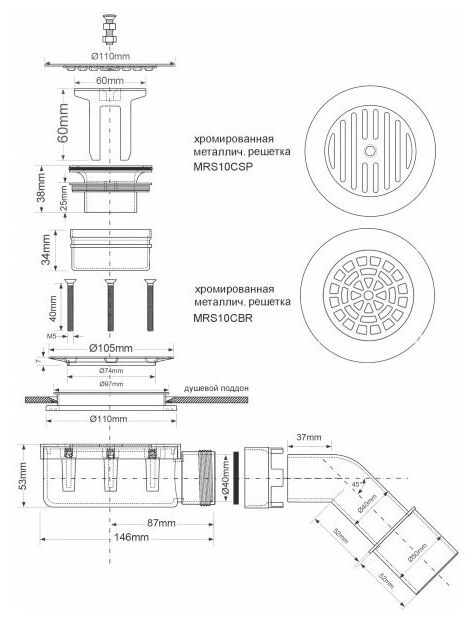 Сифон бутылочный для поддона (сливное отверстие 90-100мм) с выпуском (D105мм, крепежные винты М5х40мм) и "грибком" (дизайн "параллельные прорези") из нержавейки; высота трапа 53мм; выход Дн=40/50мм; цвет-хром