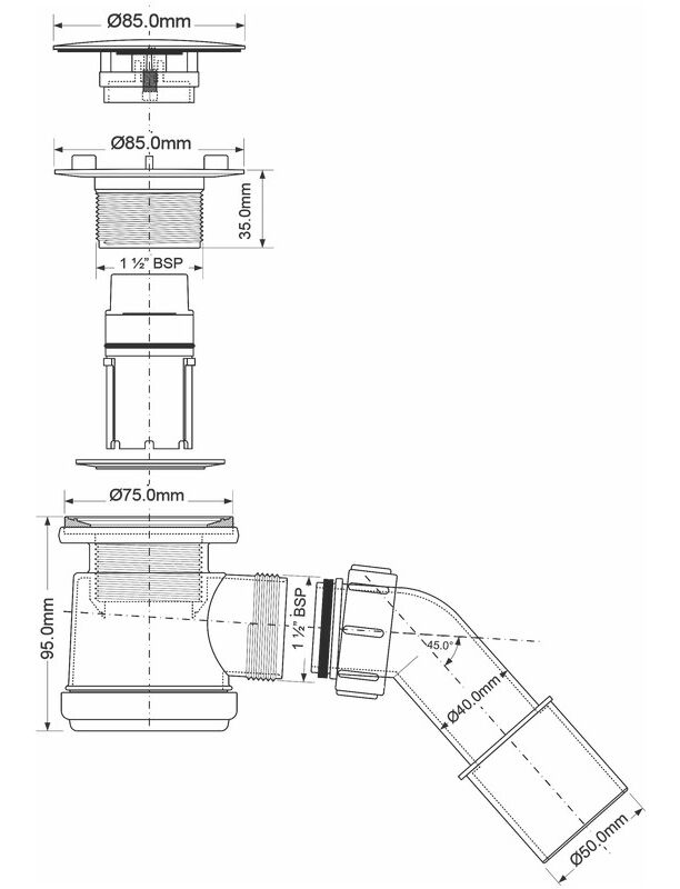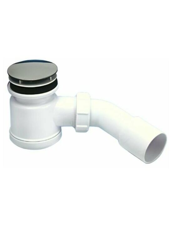 Сифон бутылочный для поддона (сливное отверстие 50-75мм) с пластиковым 85мм выпуском и "грибком" из нержавейки; высота трапа 92мм; выход Дн=40/50мм; цвет-хром