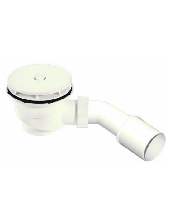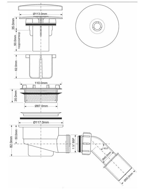 Сифон бутылочный для поддона (сливное отверстие 90-100мм) с 113мм пластиковыми выпуском и "грибком" (дизайн "Мерседес"); высота трапа 82мм; выход Дн=40/50мм; цвет-белый