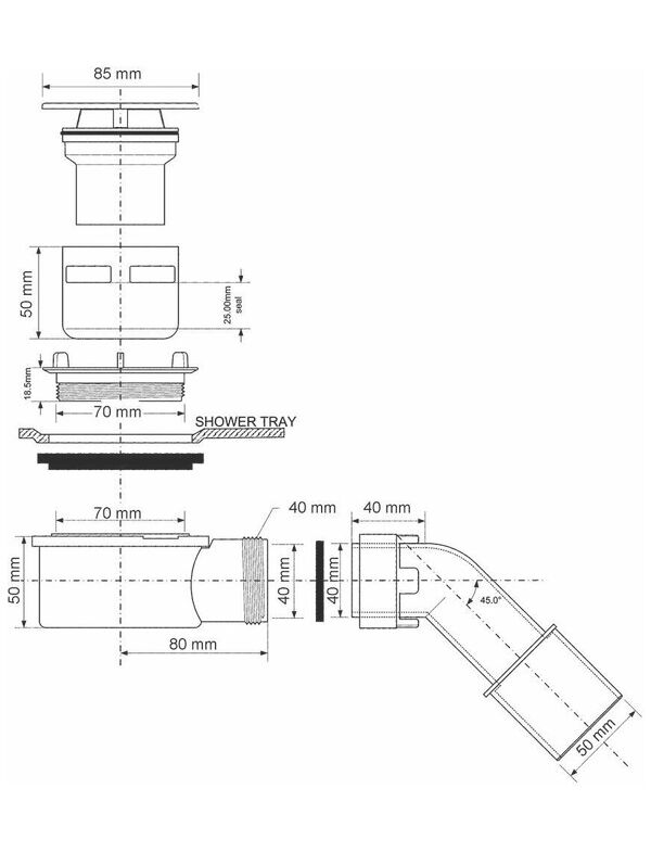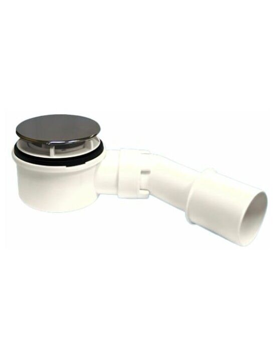 Сифон бутылочный для поддона (сливное отверстие 70-75мм) с пластиковым 85мм выпуском и "грибком" из нержавейки; высота трапа 50мм; выход Дн=40/50мм; цвет-хром