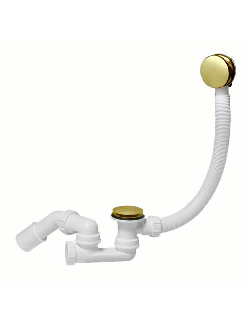 Трап (1 1/2"х40мм) для ванн с переливом (L500ммхD34мм), металлическими 70мм сливной решеткой и пробкой тип-"кнопка"; выход Дн=40/50мм; цвет-золото