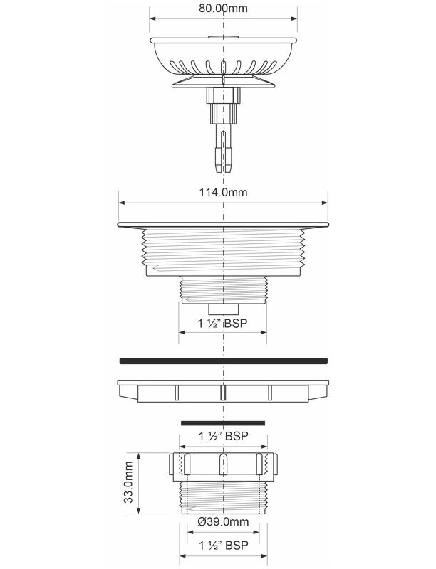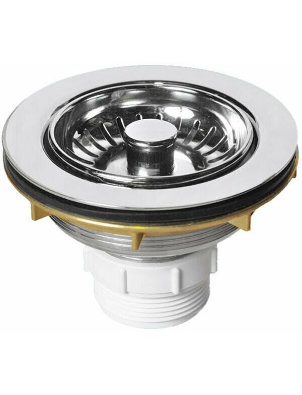 Выпуск D113мм металлический с фильтрующей решеткой-пробкой тип-"кнопка" (нержавейка с пластиком) и контргайкой; высота 56мм; выход 11/2"«папа»; цвет-хром
