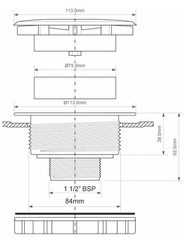 Выпуск (113мм сливная решетка) с фильтрующей решеткой и "грибком" для поддонов (сливное отверстие 90-100мм); выход 1 1/2"«папа»; цвет-белый