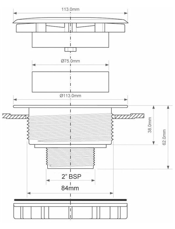 Выпуск (113мм сливная решетка) с фильтрующей решеткой и "грибком" для поддонов (сливное отверстие 90-100мм); выход 2"«папа»; цвет-хром