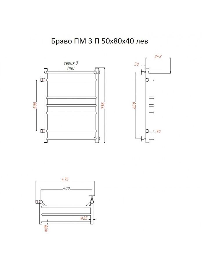 Полотенцесушитель Браво ПМ 3 П 50*80*40 (ЛЦ4) лев