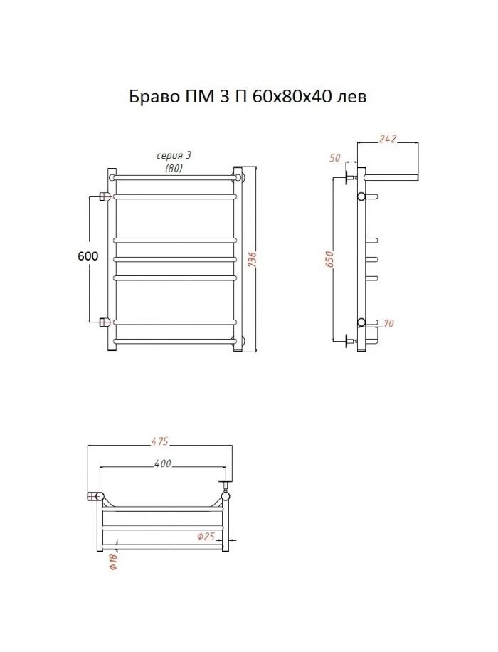 Полотенцесушитель Браво ПМ 3 П 60*80*40 (ЛЦ4) лев