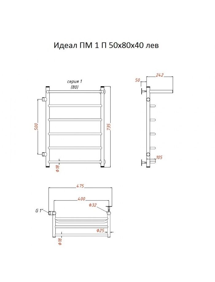 Полотенцесушитель Идеал ПМ 1 П 50*80*40 (ЛЦ5) лев