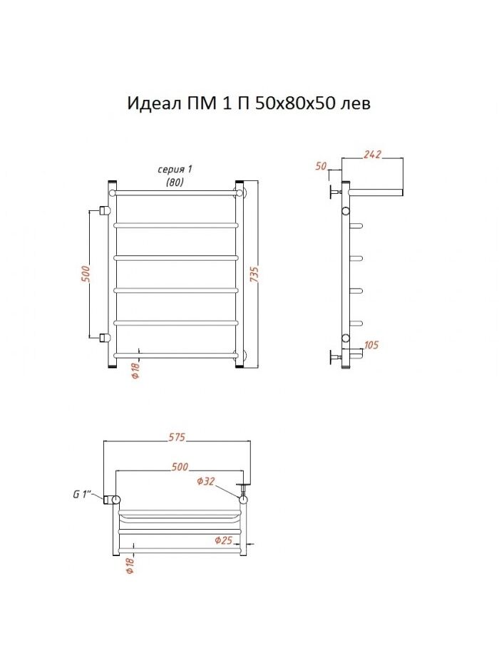 Полотенцесушитель Идеал ПМ 1 П 50*80*50 (ЛЦ5) лев
