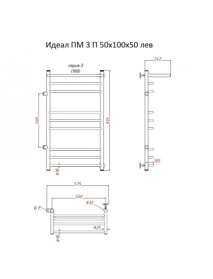 Полотенцесушитель Идеал ПМ 3 П 50*100*50 (ЛЦ5) лев