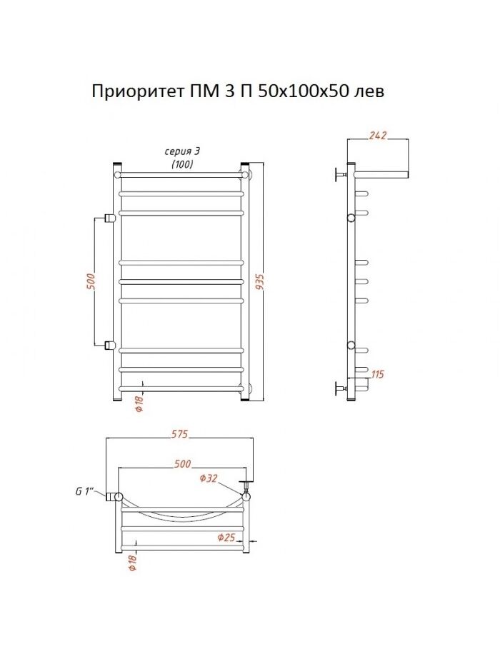 Полотенцесушитель Приоритет ПМ 3 П 50*100*50 (ЛЦ2) лев