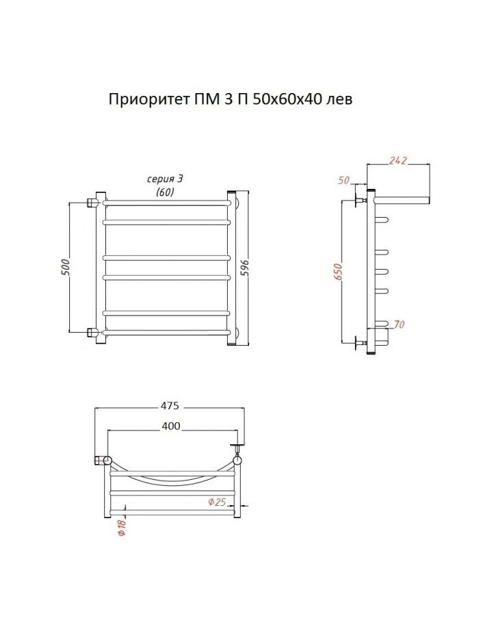 Полотенцесушитель Приоритет ПМ 3 П 50*60*40 (ЛЦ2) лев