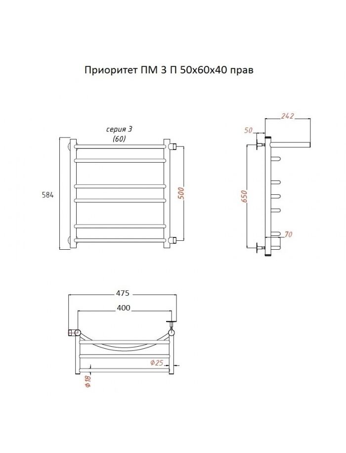 Полотенцесушитель Приоритет ПМ 3 П 50*60*40 (ЛЦ2) прав