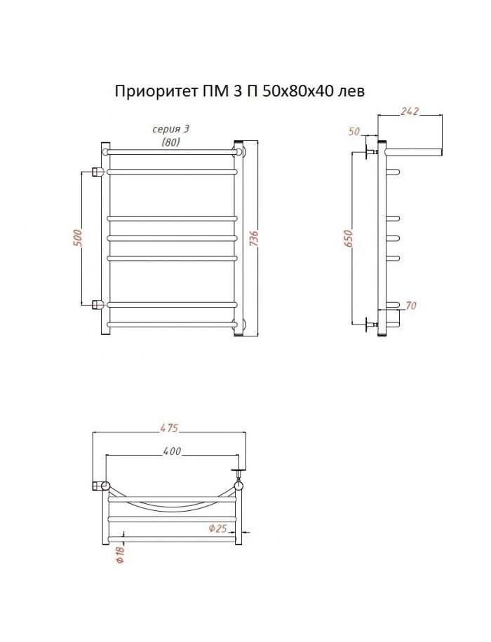 Полотенцесушитель Приоритет ПМ 3 П 50*80*40 (ЛЦ2) лев