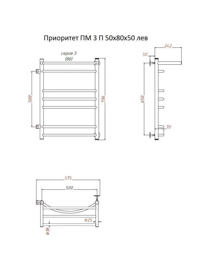 Полотенцесушитель Приоритет ПМ 3 П 50*80*50 (ЛЦ2) лев