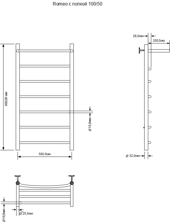Полотенцесушитель водяной Aquanet Romeo с полкой 1000x500, с полкой, хром