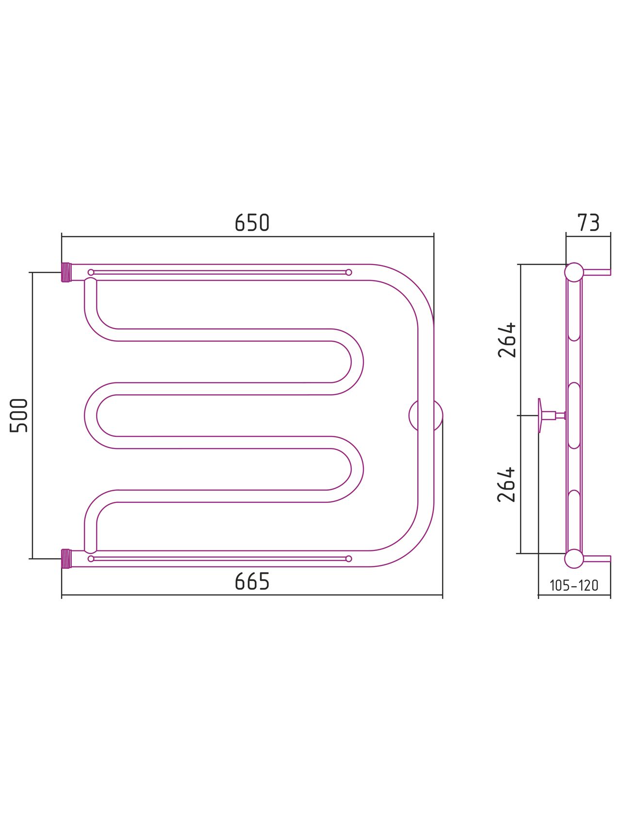 Полотенцесушитель водяной Стилье Тандем 2 полки 500х650 резьба-сгон 1"