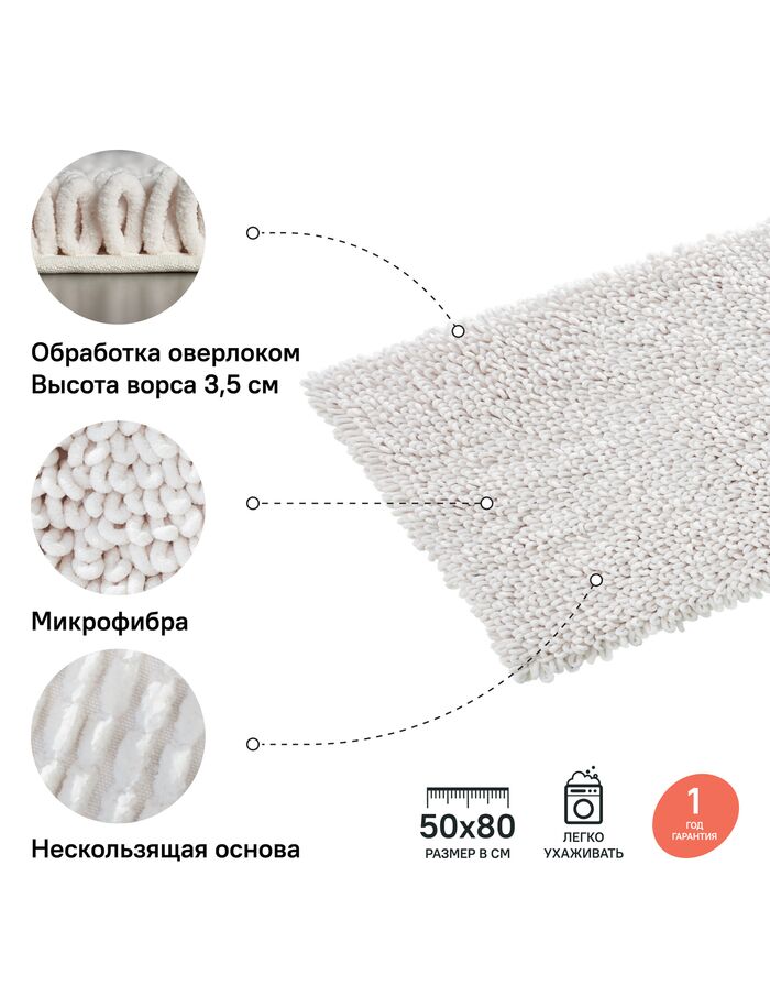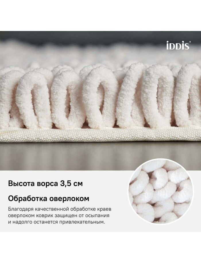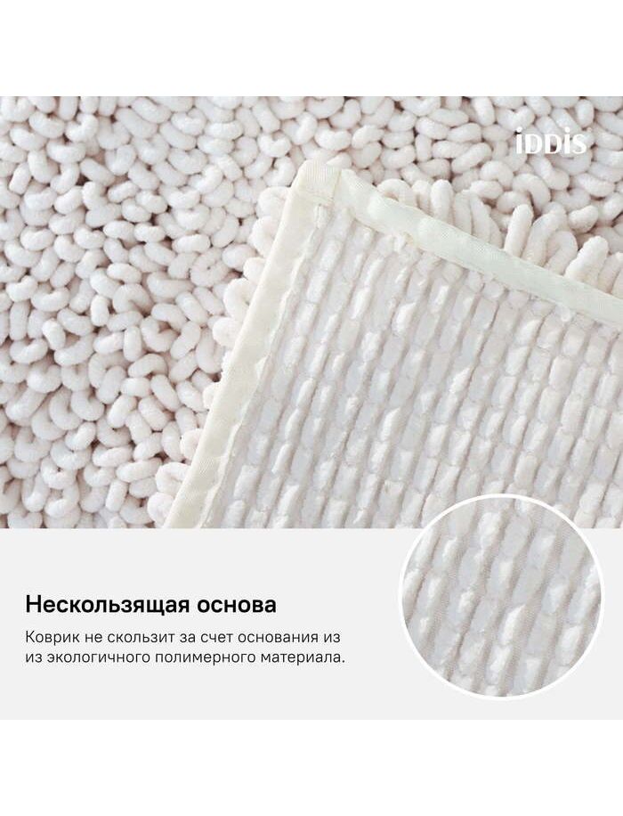 Плюшевый коврик для ванной нежного бежевого цвета с очень мягким и приятным на ощупь высоким ворсом (3,5 см) в виде плотных петель. Он отлично сохраняет тепло и держит форму, сохраняя красивый внешний вид. Коврик подойдет для ванной и туалета.• Этот коврик в ванную противоскользящий: нескользящая основа из экологичного полимерного материала (Hotmelt) не пропускает влагу и не впитывает запахи.