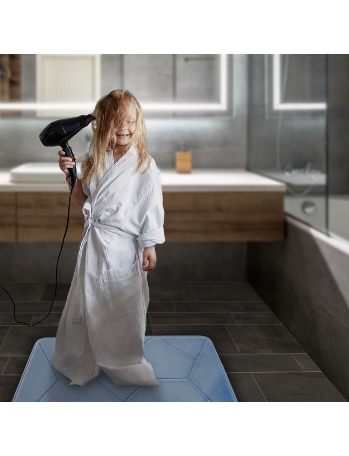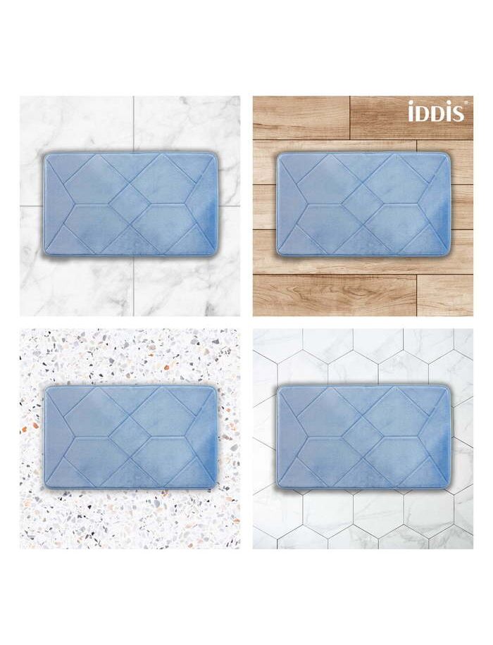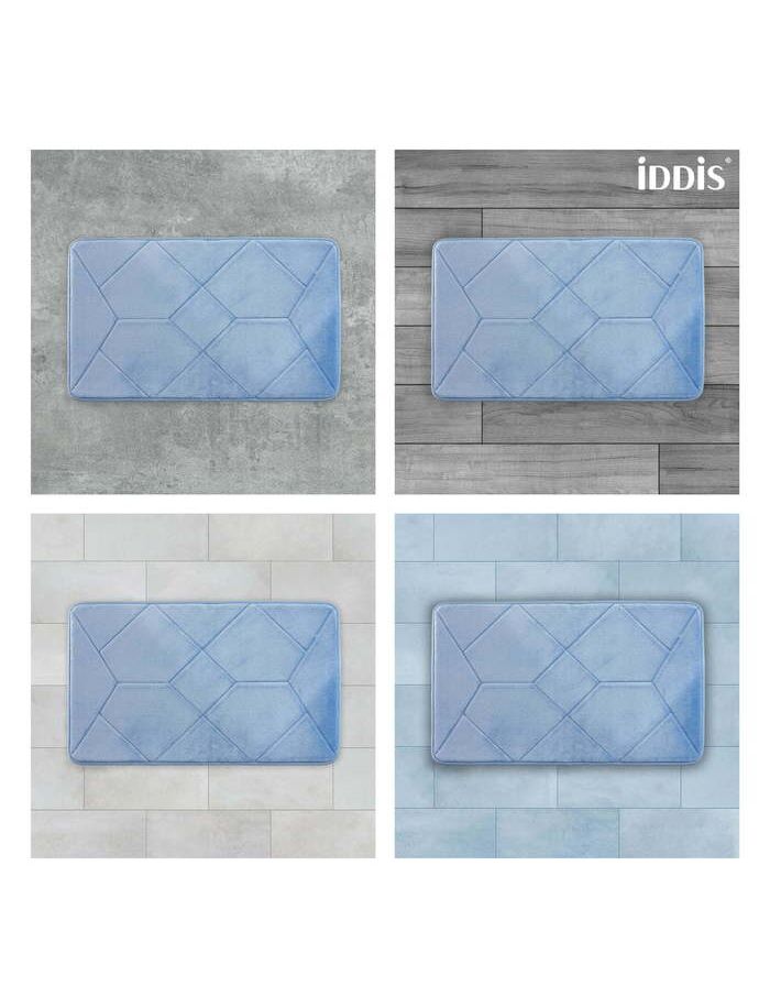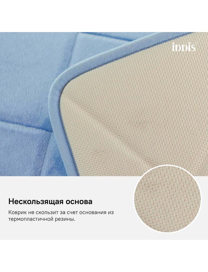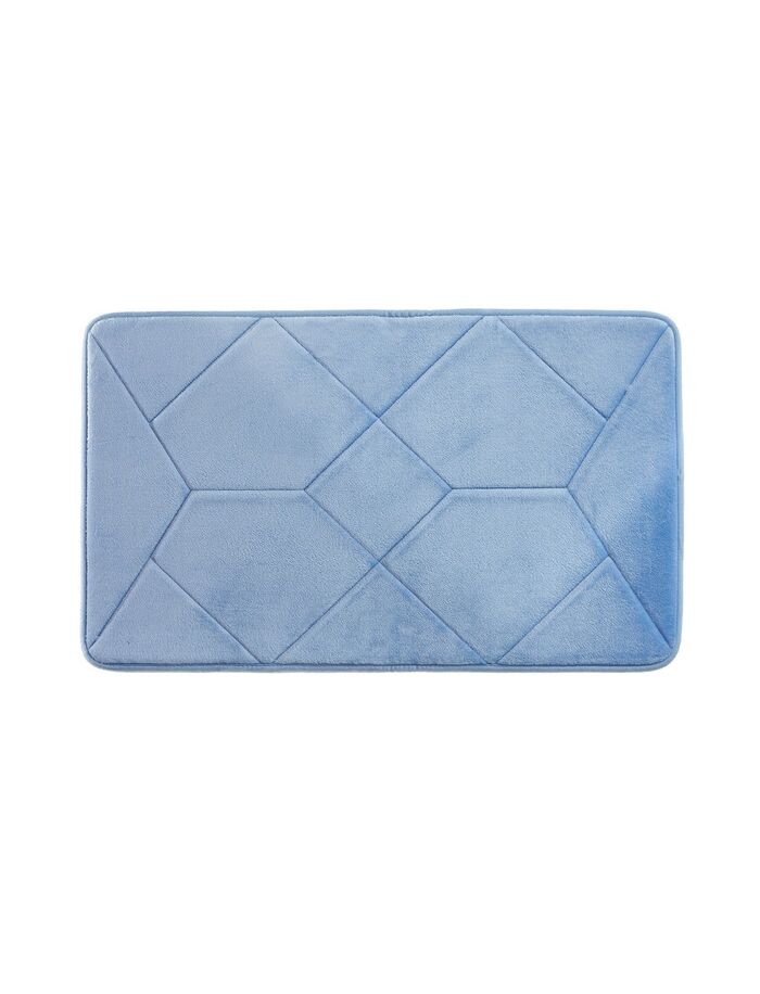 Удивительно мягкий коврик для ванной небесно-голубого цвета с ромбовидным узором и эффектом памяти. Запоминающая пена премиум-класса очень эластична и принимает форму стопы, обеспечивая ее комфорт и поддержку. Этот массажный эффект помогает сохранить ощущение расслабленности после душа. Коврик подойдет для ванной и туалета.• Этот коврик в ванную противоскользящий: основа из премиальной термопластичной резины (SBR) не скользит на гладком и влажном кафеле. Материал напоминает натуральный каучук, но более прочный и стойкий к загрязнениям. Подходит для использования на теплых полах.