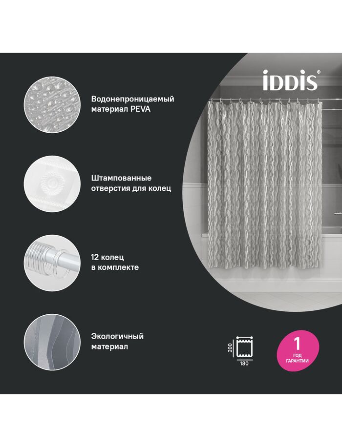 Штора для ванной, 200x180 см, 3D, PEVA, IDDIS, P03PV18i11