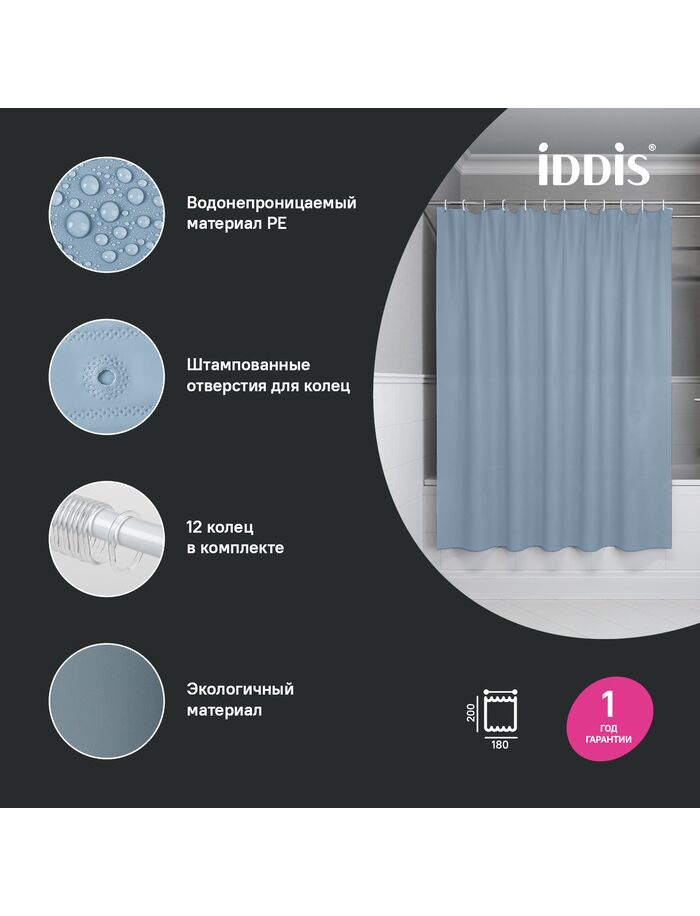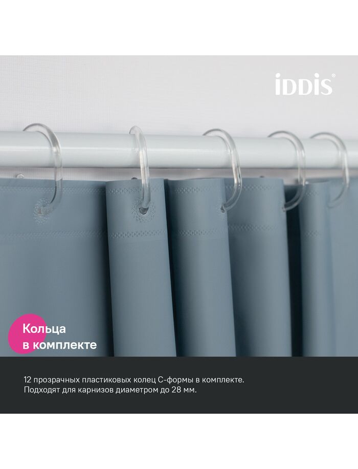 Штора для ванной, 200x180 см, PE, светло-серый, IDDIS, P09PE18i11