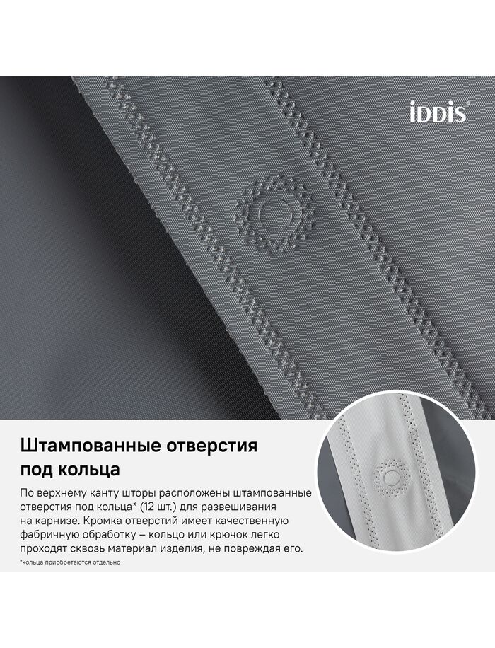 • По верхнему краю 12 штампованных отверстий-люверсов– кольцо/крючок легко пройдет насквозь, не повредив шторы.