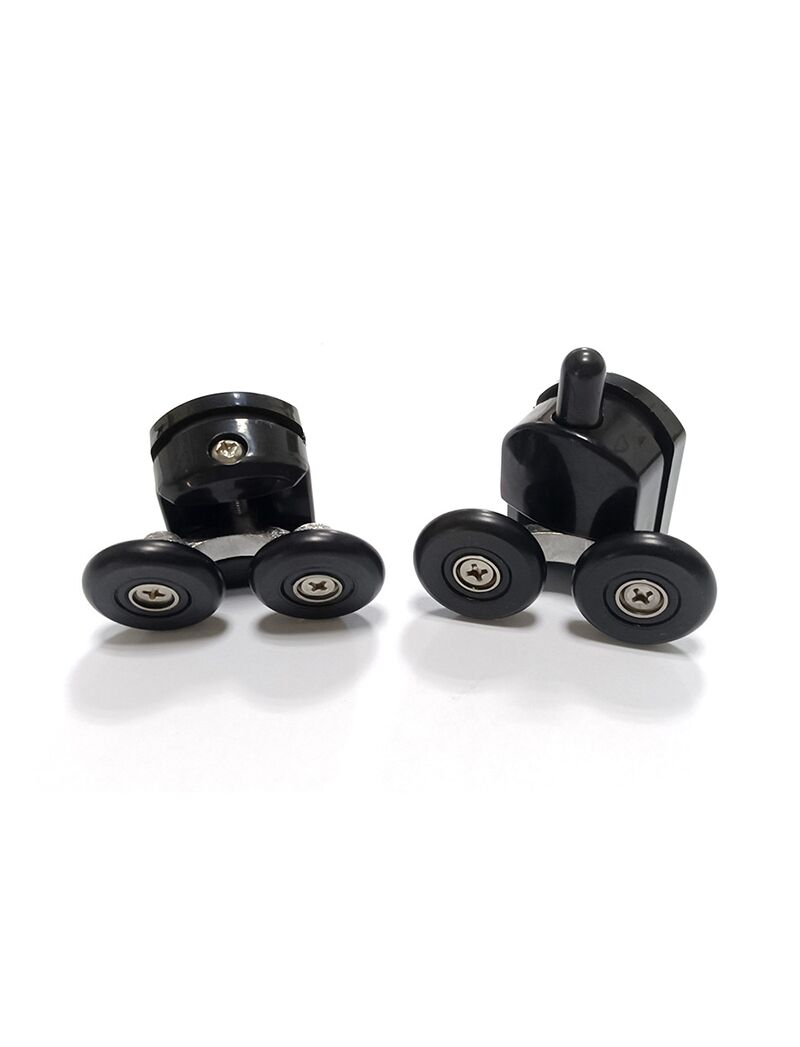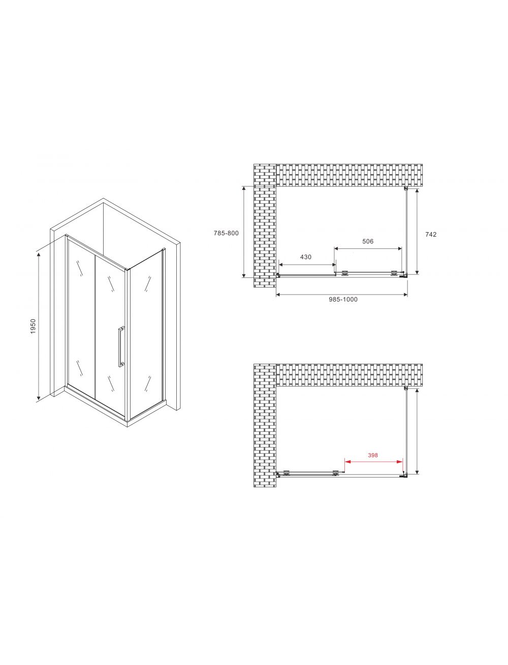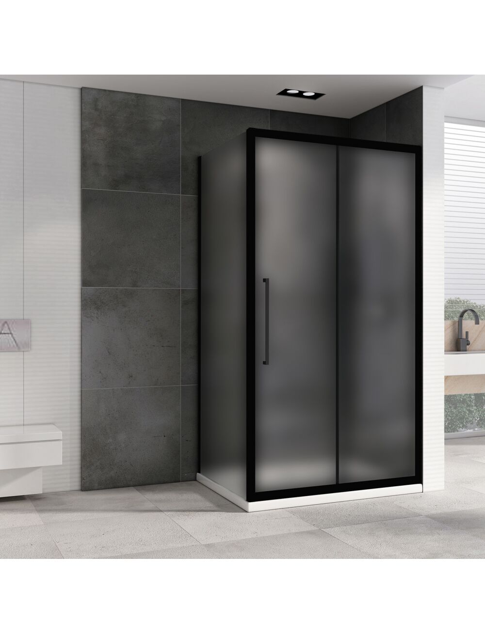 Прямоугольный душевой уголок Двери: одна раздвижная Стекло: закаленое матовое 6 мм Профиль: черный Особенности: • увеличенные металлические ручки • двойные металлические ролики • универсальный монтаж • поддон приобретается отдельно