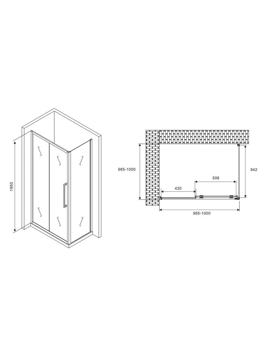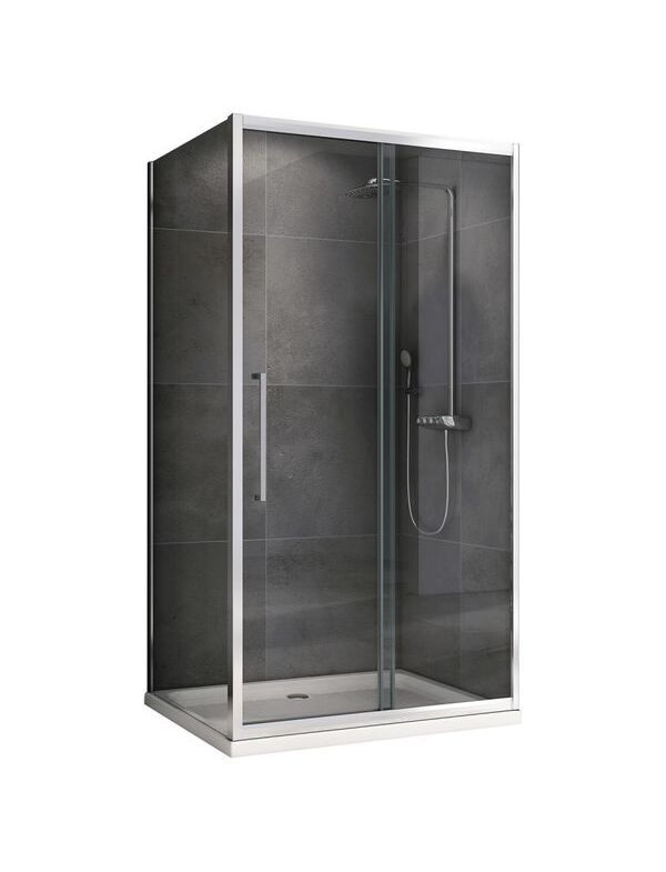Прямоугольный душевой уголок Двери: одна раздвижная Стекло: закаленое прозрачное 6 мм Профиль: хром Особенности: • увеличенные металлические ручки • двойные металлические ролики • универсальный монтаж • поддон приобретается отдельно
