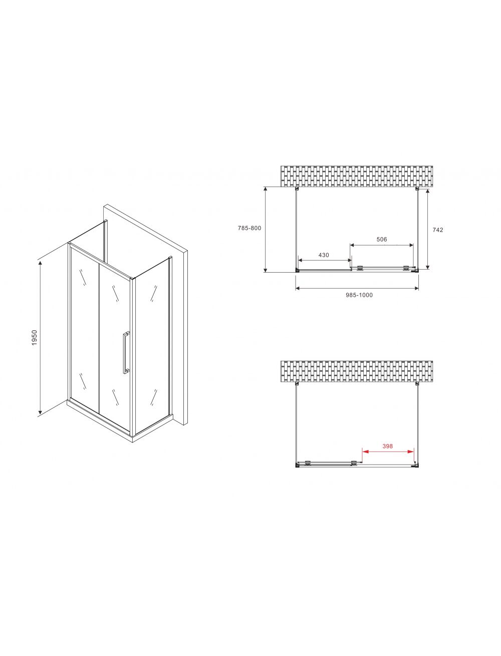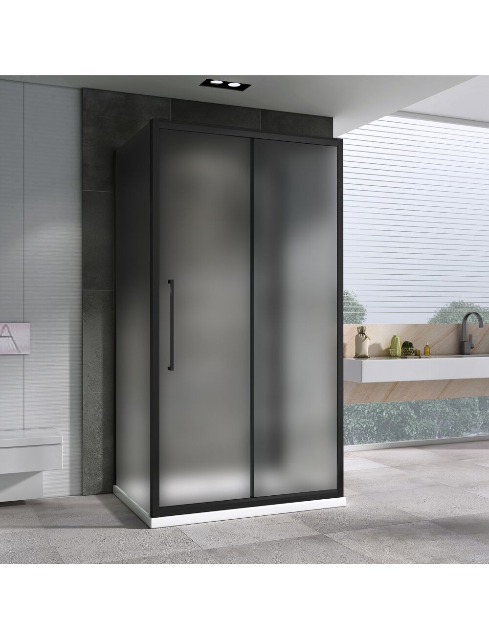 Прямоугольный П-образный душевой уголок, пристенная установка Двери: одна раздвижная Стекло: закаленое матовое 6 мм Профиль: черный Особенности: • увеличенные металлические ручки • двойные металлические ролики • универсальный монтаж • поддон приобретается