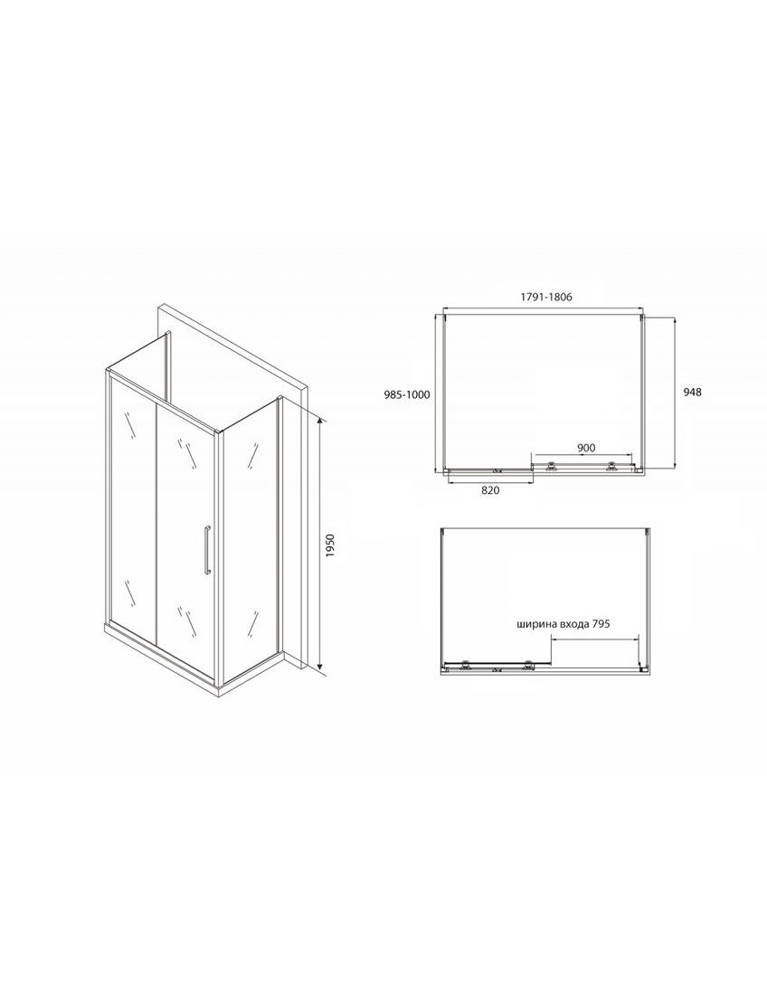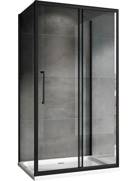 Прямоугольный П-образный душевой уголок, пристенная установка Двери: одна раздвижная Стекло: закаленое прозрачное 6 мм Профиль: черный Особенности: • увеличенные металлические ручки • двойные металлические ролики • универсальный монтаж • поддон приобретае