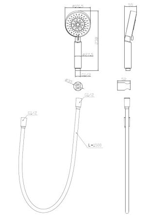 Ручной душ пятирежимный со шлангом PVC 150 см и держателем, хром, BB-DFS-5-CRM