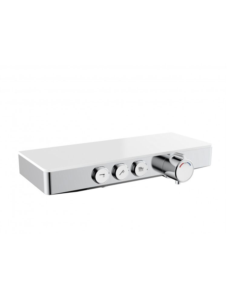 Форма корпуса смесителя выполнена в виде полочки из закаленного стекла, позволяя комфортно хранить необходимые принадлежности для душа.