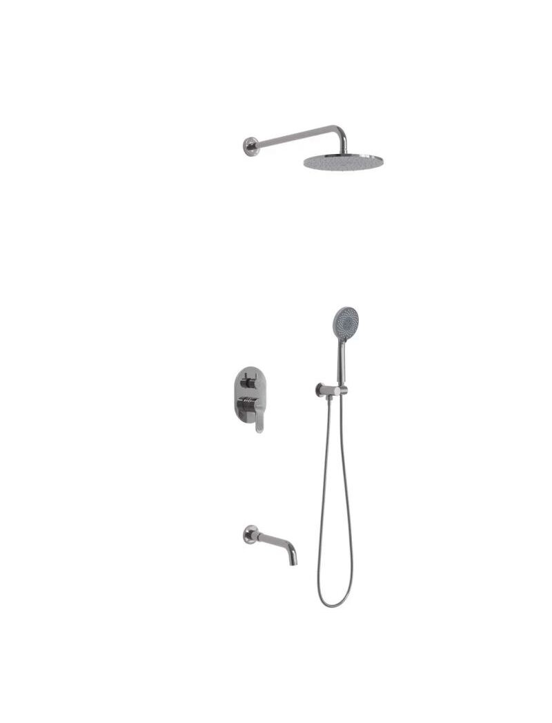 Душевой комплект BERGES NARDIS 3R - встраиваемый душевой комплект обладает трёхрежимной системой и состоит из верхней лейки - «тропического ливня», ручного душа, излива и смесителя. Лейка верхнего душа имеет инновационную систему самоочистки в виде гибких силиконовых вставок на форсунках душа, которые защищают изделие от известковых отложений. Изготовлены оба душа из ABS пластика, имеют хромоникелевое покрытие, которое выглядит безупречно на протяжении всего периода эксплуатации. Шланг выполнен из нержавеющей стали (внутри epdm), смеситель с латунным корпусом имеет керамический картридж с пропускной способностью 28 л/мин, все держатели и кронштейны сделаны из латуни и нержавеющей стали.Скрытый монтаж комплекта позволяет создавать красивое и эргономичное внутреннее пространство всего помещения.