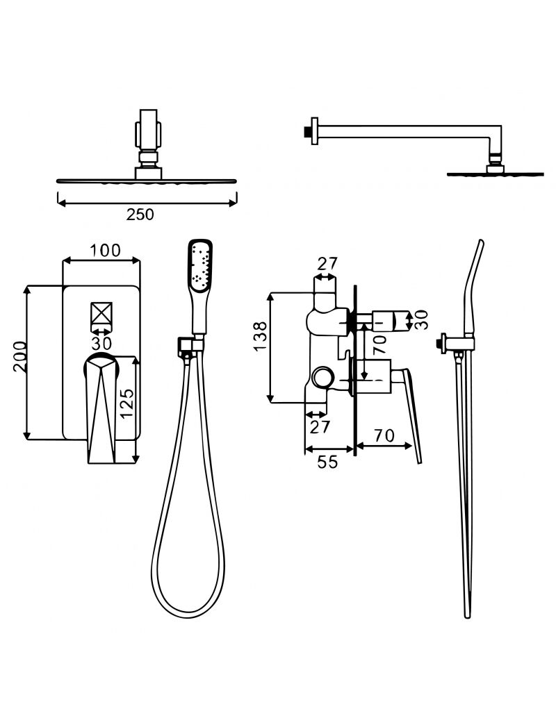 Смеситель встроенный + верхний душ + ручной душ ХРОМ