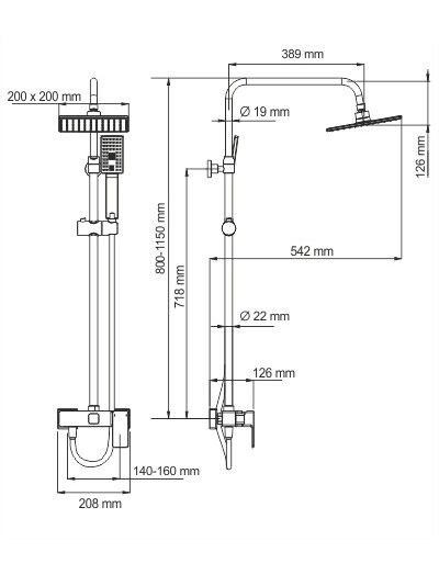 - Верхний душ 200х200 мм, с шарнирным соединением, угол поворота 22°
