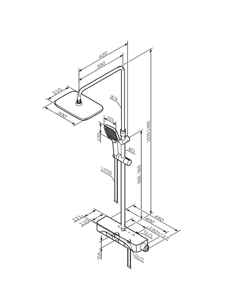 F078F322 Func, душ.сис-ма: см-ль-полка д/ванны/душа с ТМС, душ.штанга, верхн. душ квадр., ручн.душ,