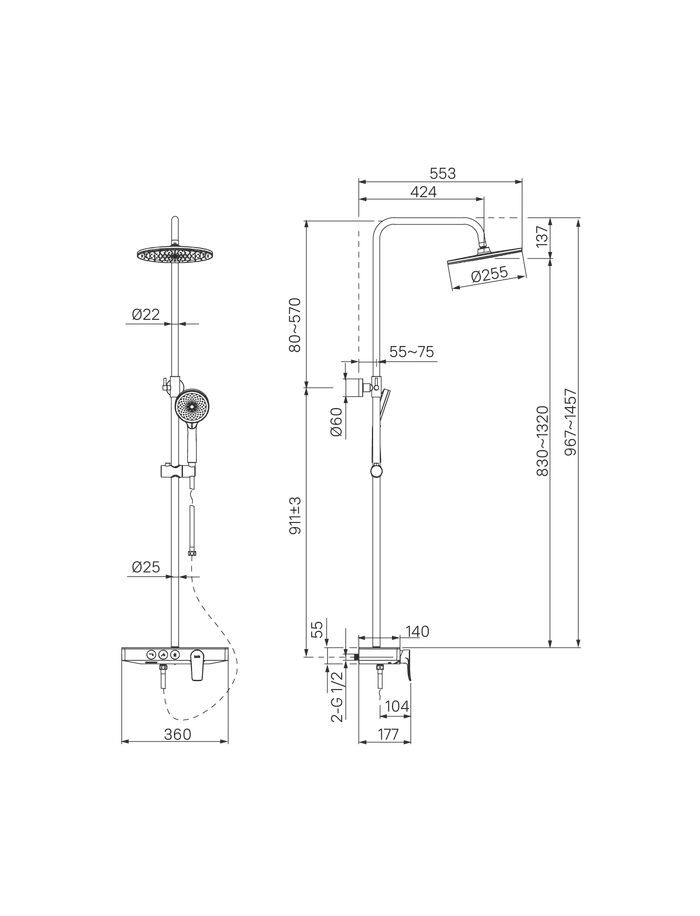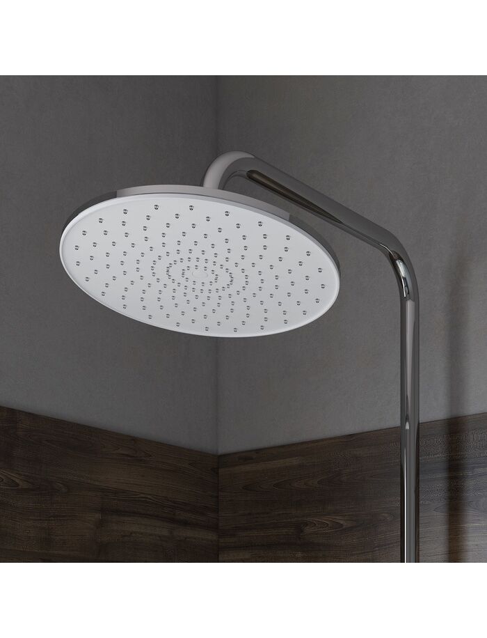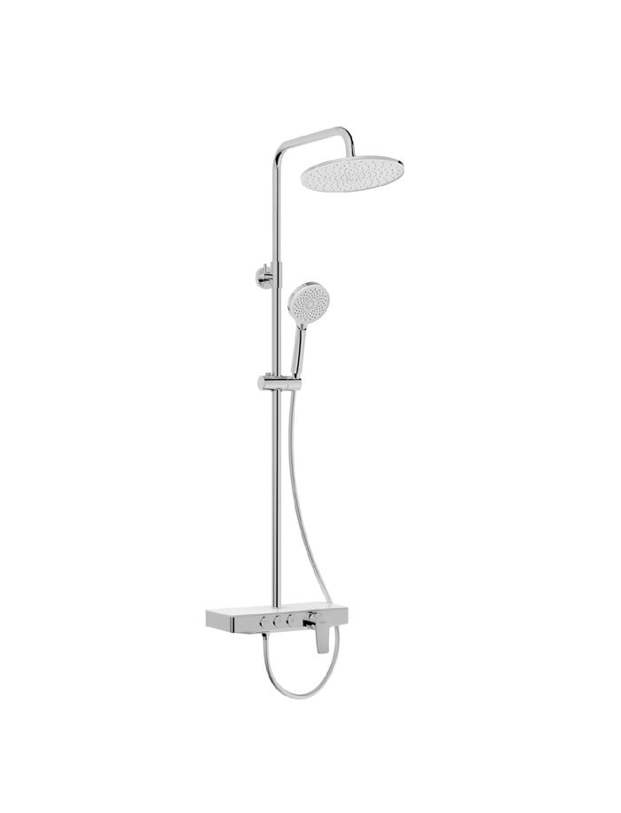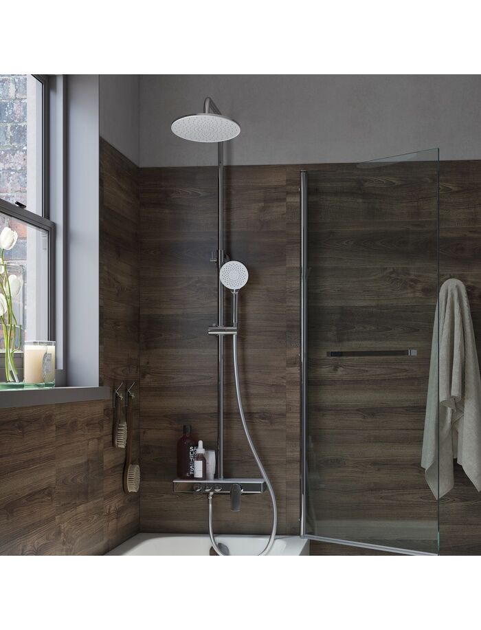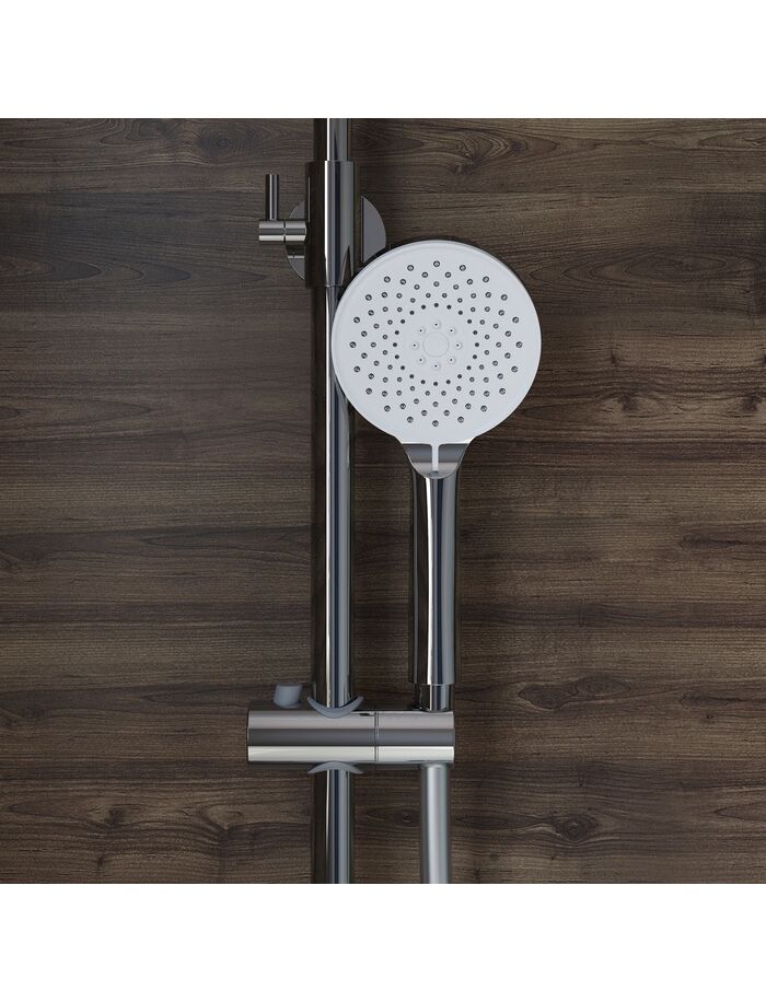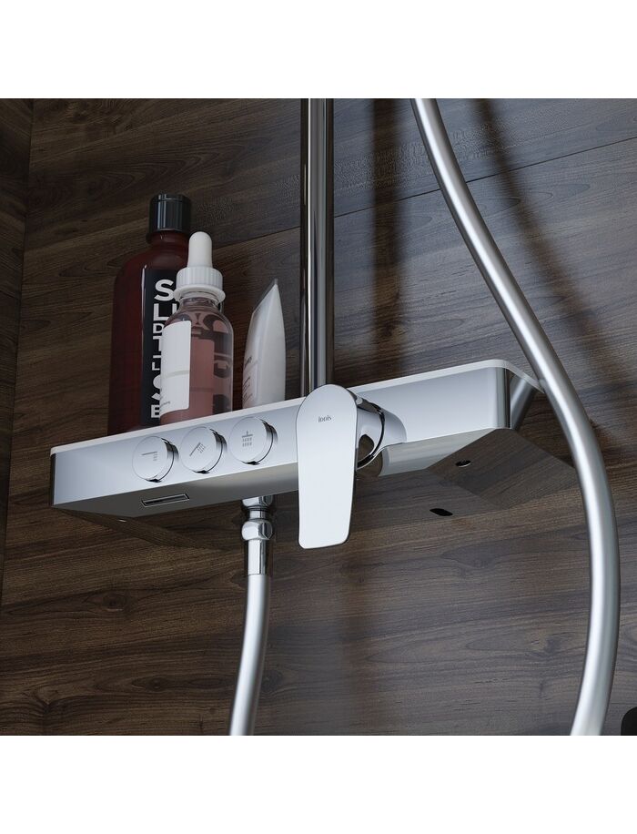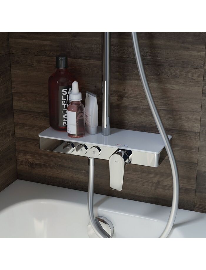 Смеситель для ванны с верхним душем Shelfy – мечты о будущем, доступные уже сегодня. Модель в цвете хром обращает на себя внимание дизайнерским корпусом с декоративными элементами из закаленного стекла и стильными белыми вставками. Одновременно технологичное и невероятно простое управление Push Control позволяет кнопками осуществлять переключение режимов с излива на верхнюю или нижнюю лейку. Регулировка температуры воды до комфортной производится поворотом ручки, оптимальный напор воды – определяется при установке. Любимые косметические средства будет удобно разместить на небольшой полочке на корпусе смесителя. • Хромированное покрытие смесителя IDDIS® устойчиво к появлению царапин и потускнению (при должном уходе). На протяжении многих лет он будет выглядеть как новый.
