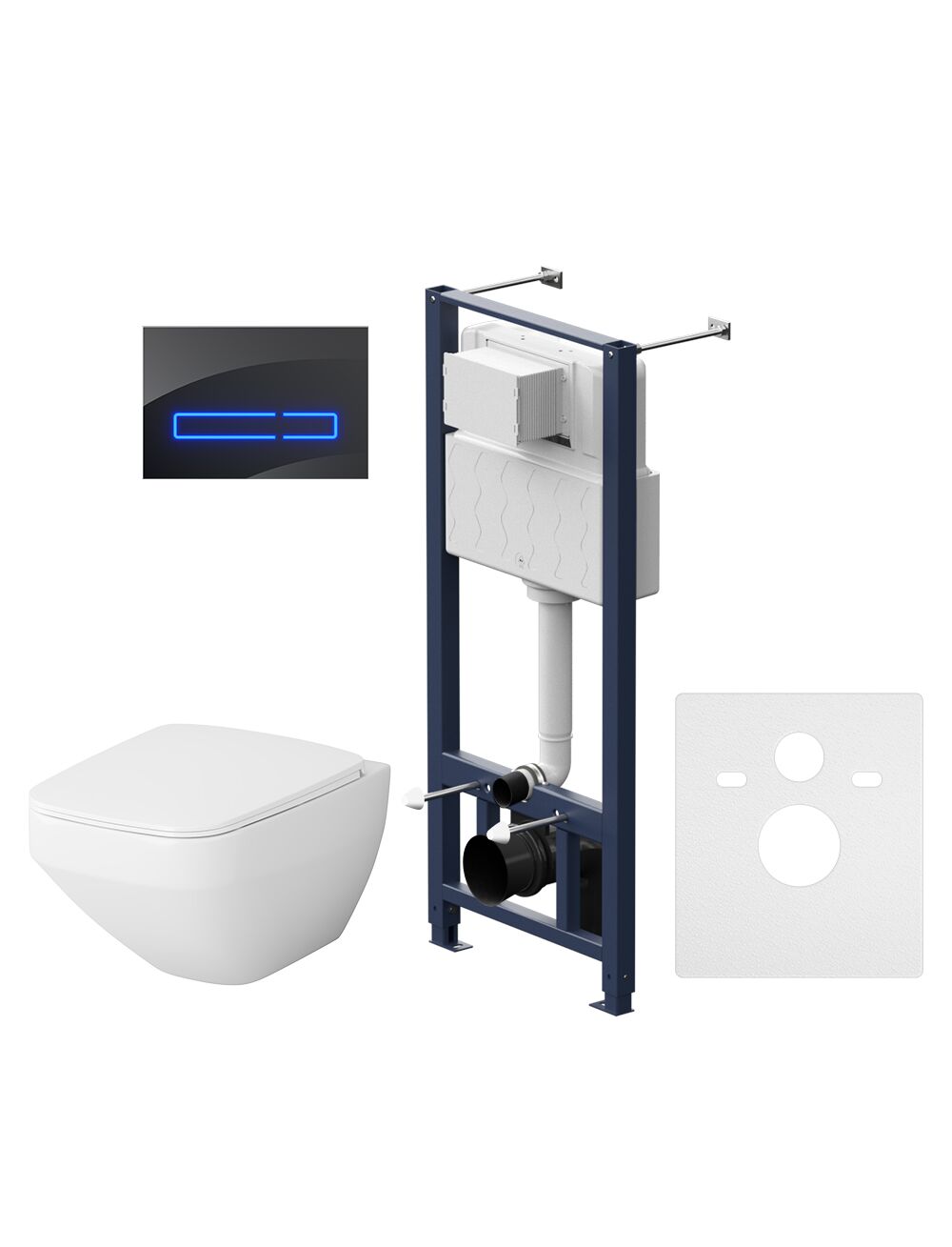 - Полностью готовый к установке комплект: система инсталляции с клавишей, подвесной унитаз сиденьем.