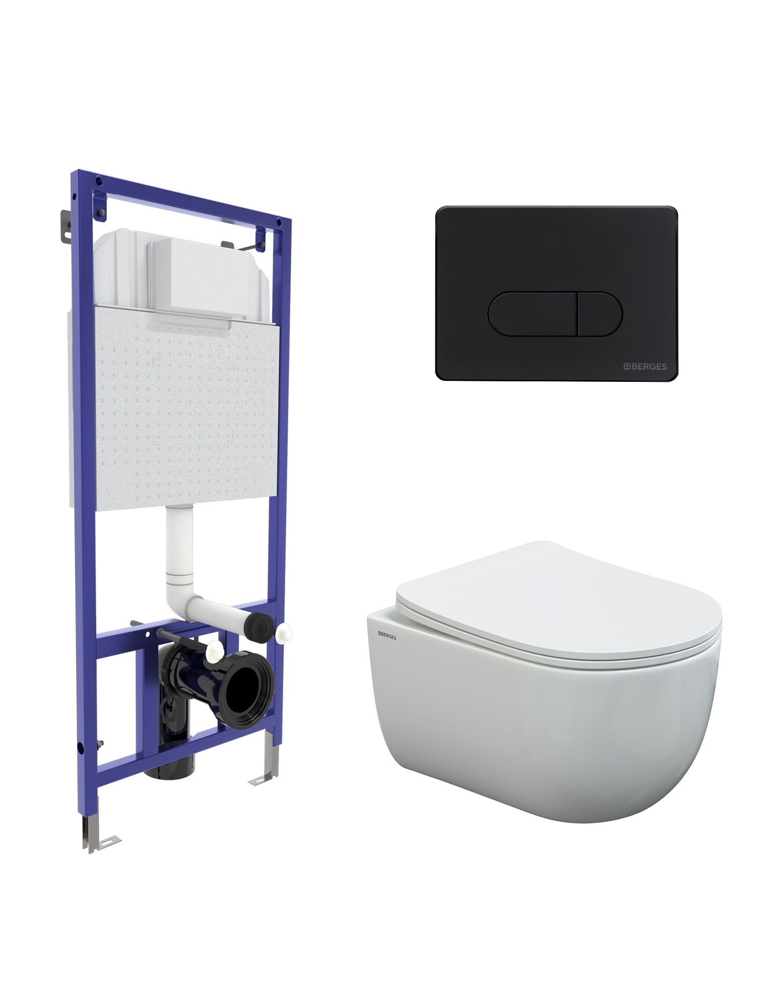 Комплект BERGES для монтажа подвесного унитаза: инсталляция NOVUM525, кнопка D5 черная Soft Touch, унитаз VENTAS Rimless, сиденье дюропласт Ventas Slim SO, микролифт, быстросъем