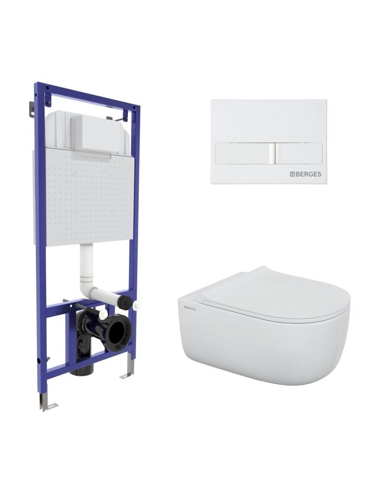 Комплект BERGES для монтажа подвесного унитаза: инсталляция NOVUM525, кнопка L1 белая, унитаз EGO XL Rimless, сиденье дюропласт Okus Slim SO, микролифт, быстросъем