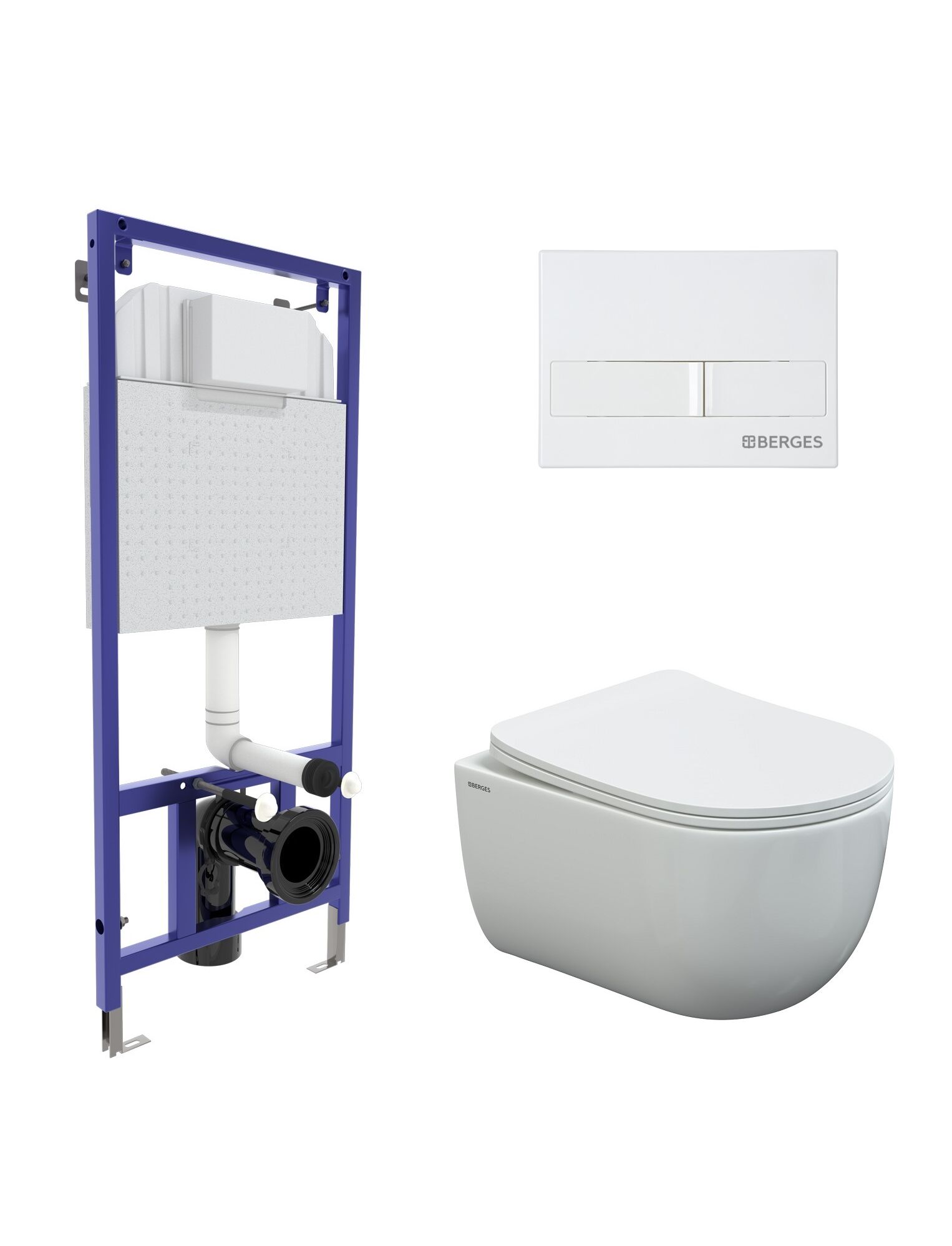 Комплект BERGES для монтажа подвесного унитаза: инсталляция NOVUM525, кнопка L1 белый, VENTAS Rimless, сиденье дюропласт Ventas Slim SO, микролифт, быстросъём