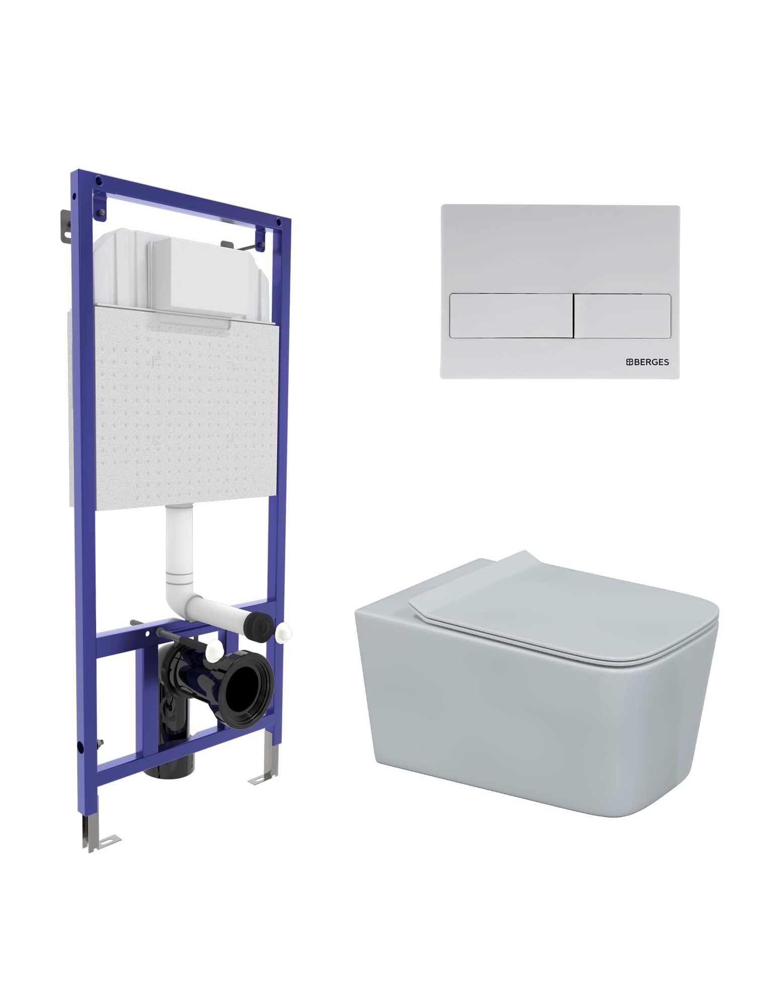 Комплект BERGES для монтажа подвесного унитаза: инсталляция NOVUM525, кнопка L4 Soft Touch белая, унитаз FLOE, сиденье дюропласт FLOE Slim SO
